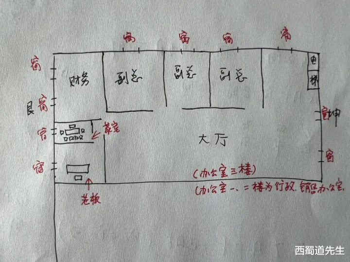 老板的位置,设计在北边,与南边的电梯形成“水火既济”,阴阳交合。老板坐西北向东南,吃外面三条水路之逆水而来。又纳当旺之气。这样布局,2015和2016年则大发横财。设计好,很快就建成。2025年搬入,业绩大增长。2016年,业绩增长五倍。。。。2020年,公司在三板上市。阳宅风水,讲究制化。这个和阴宅不一样的。有很多人攻击三僚杨公,认为三僚那么多风水大师,却没有出一个进士状元?制化,只是没有办法的情况下寻找解决问题的办法,这种在阳宅风水中有用,但是阴宅风水中解决一般问题可以,要想用制化出大贵,难上加难。阴宅风水重龙,没有好的龙脉,任你如何制化也不显贵。而三僚却一直在阴宅的道路上寻求突破,阳宅制化显效但却没有传承。风水门派,各有各的好,各有各的功。菜无所谓好坏,看炒菜的那个人罢了。