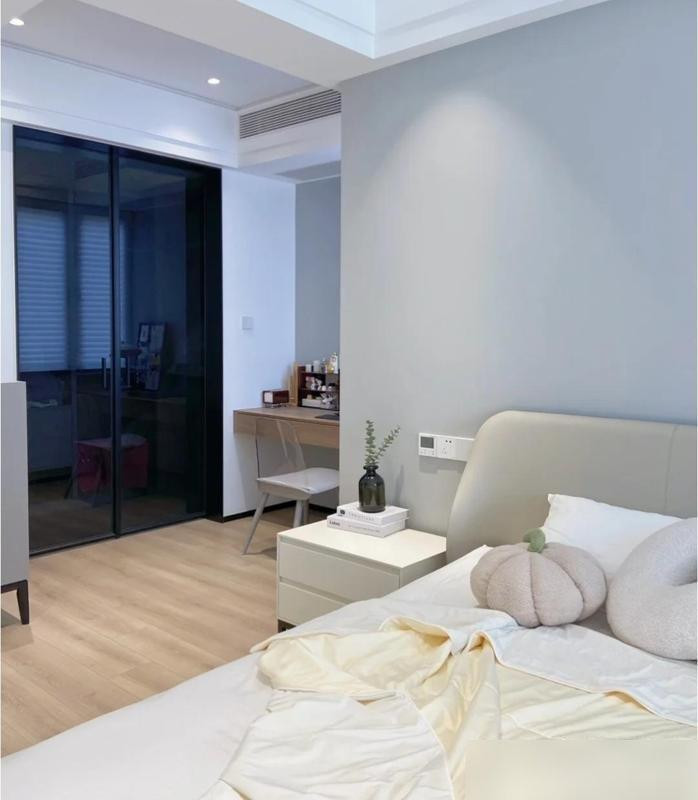 主卧的无主灯组合我太爱了——之前总觉得“卧室必须有大灯”,结果装了个水晶灯,晚上起夜开了晃得眼睛疼,看书又嫌暗。人家用射灯打天花板,床头灯调暖光,台灯放床头柜,晚上躺床上看书不刺眼,起夜开个床头灯,昏黄的光裹着被子,连起床气都少了。还有那透明亚克力置物架,摆点香薰、小摆件,轻得像片云,比那些雕花纹的木质架子舒服多了——你说那些花大价钱买的“网红置物架”,能有这种“看着不烦、用着不累”的质感吗?