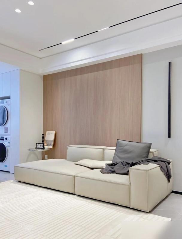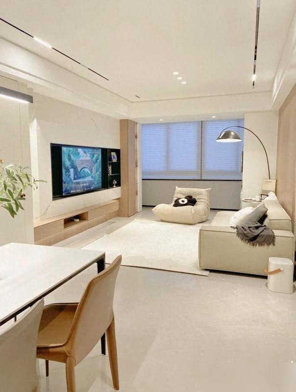 再看客厅,没装大吊灯——我之前也怕“无主灯显暗”,结果人家用射灯+轨道灯,光线柔得像傍晚的夕阳,打在浅灰地砖上,整个屋子亮堂却不刺眼。沙发选的是软乎乎的羽绒款,坐上去能陷进去半个人,我看照片都想伸手摸一把——你说那些硬邦邦的“网红沙发”,能有这种“瘫着不想起来”的快乐吗?浅灰地砖通铺到厨房,没有隔断,空间显大不说,打扫的时候推个吸尘器就走,不用抠地砖缝的灰尘,这才叫“懒人的聪明”啊!