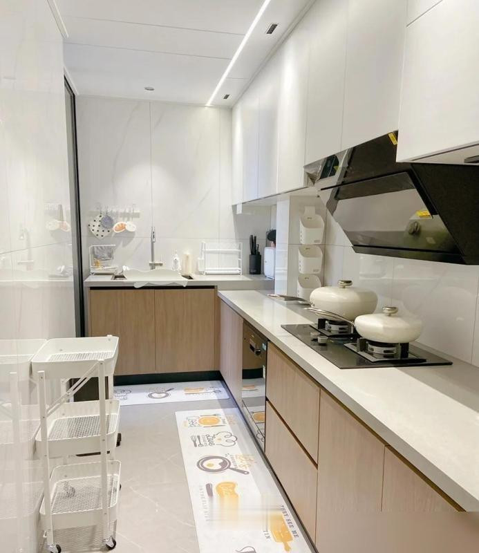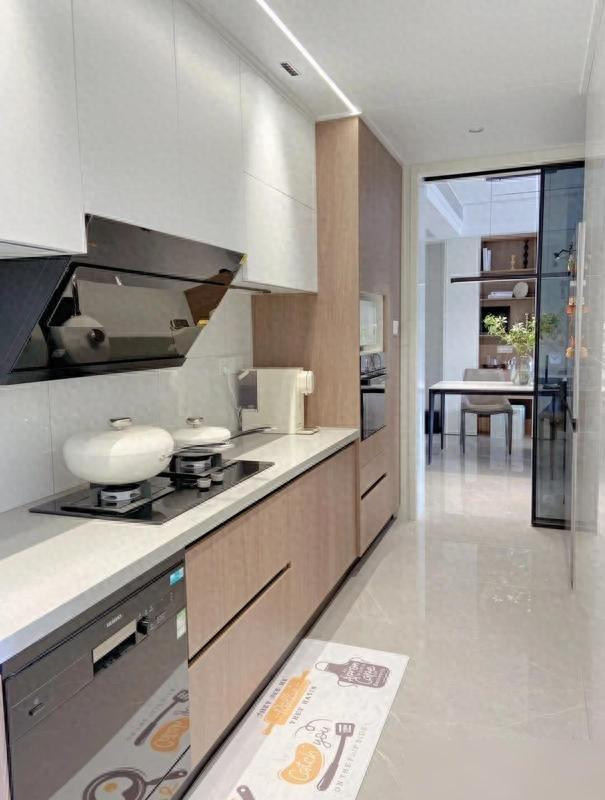 L型布局打通了小阳台,转身拿锅不用绕圈,高柜里嵌了蒸烤箱、洗碗机——我朋友家厨房就是“电器堆成山”,微波炉放台面上,烤箱塞柜子顶,每次烤面包都得搬凳子,油溅得台面全是。可人家把电器都“藏”起来,台面清清爽爽,切菜时一伸手就能拿到刀,炒完菜直接把碗塞进洗碗机,你说这是不是“把做饭的麻烦都砍没了”?
